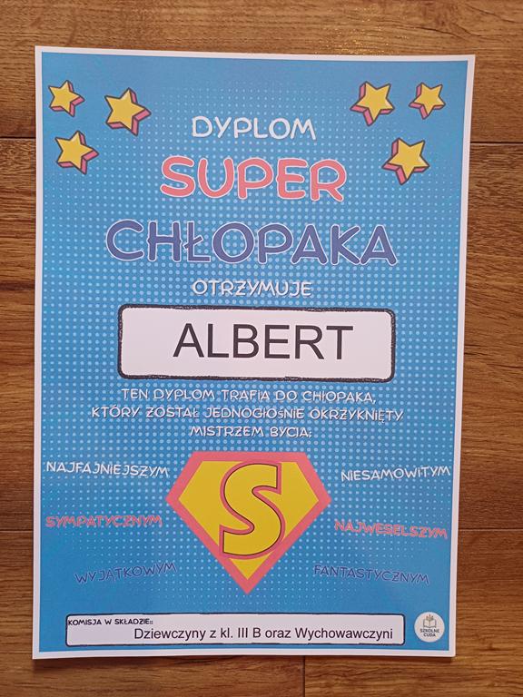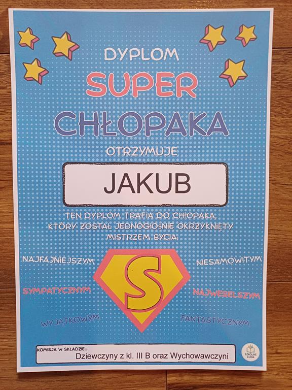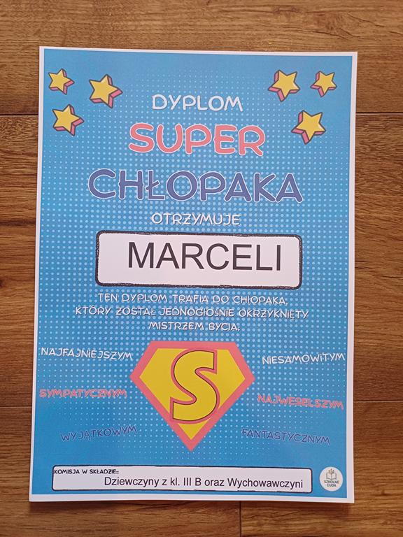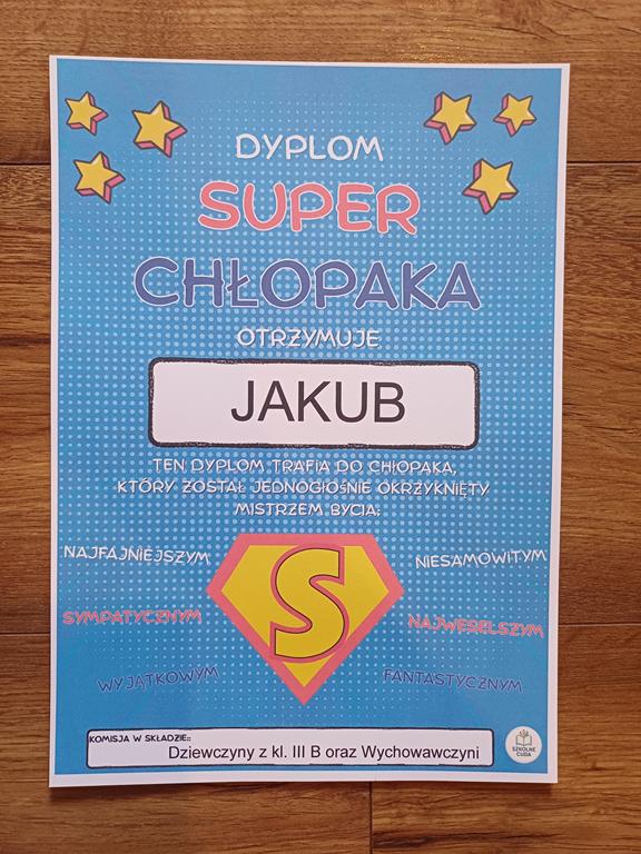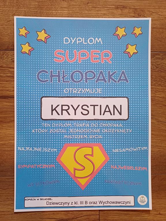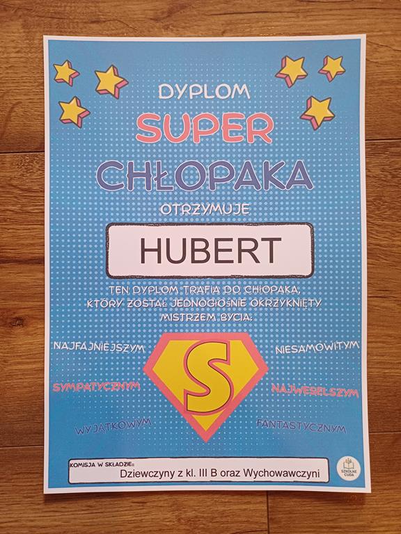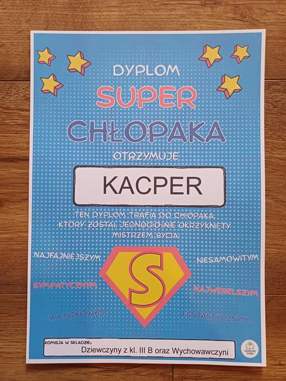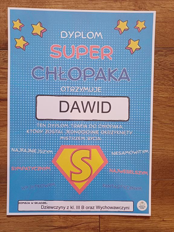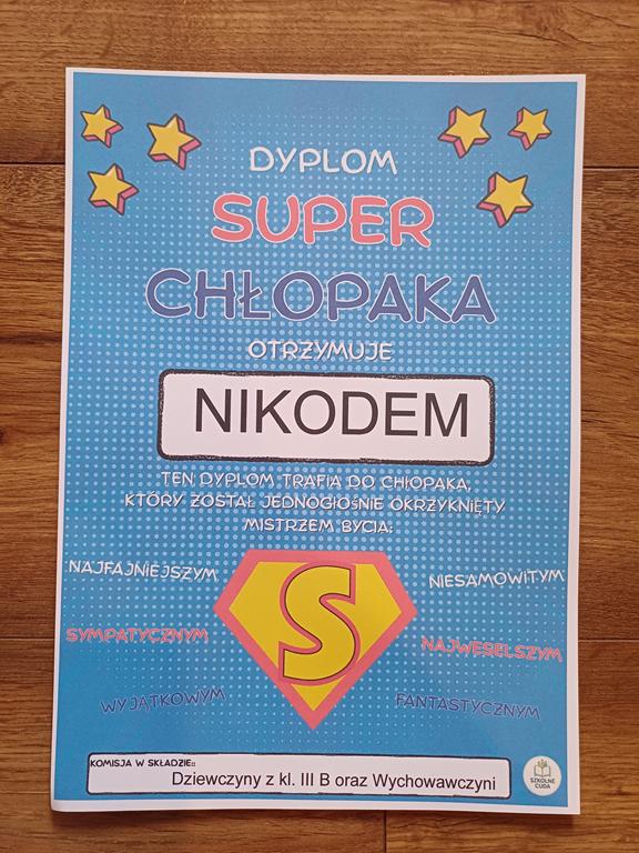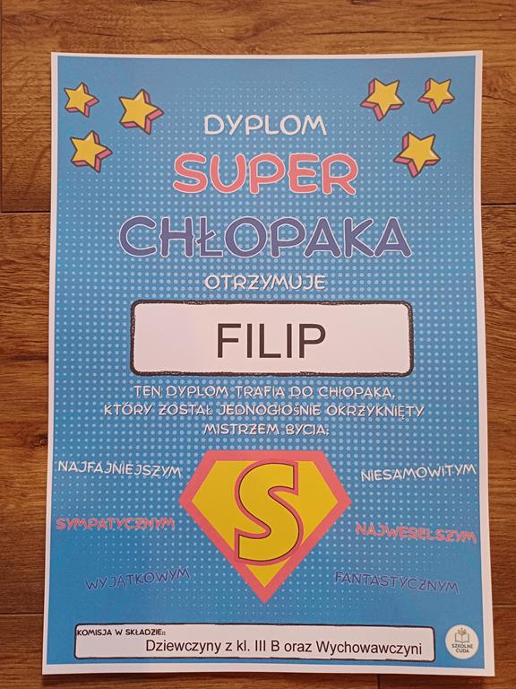 Chłopcy w klasy 3B otrzymali od koleżanek z klasy oraz wychowawczyni słodki upominek oraz dyplom SUPER CHŁOPAKA.